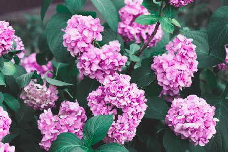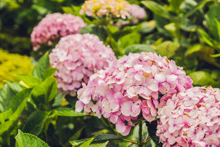 Amazing pink Hydrangea flowers in a garden. Selective focus.