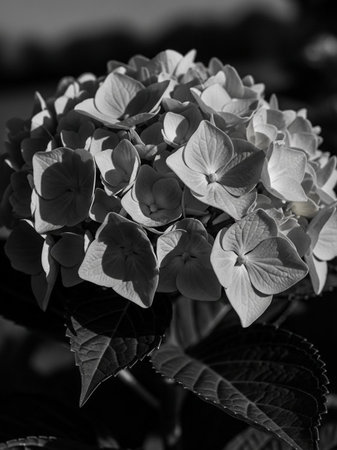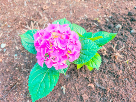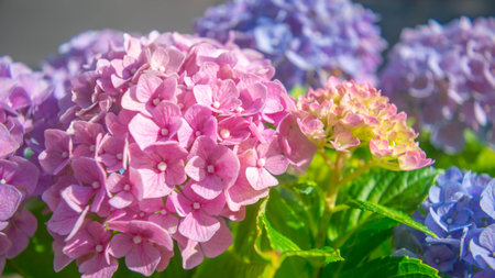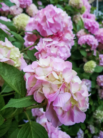 Closeup of hydrangea (Hydrangea macrophylla) are blooming in spring and summer at a town garden. The Japanese call this