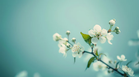 Captivating white blossoms adorn a slender branch, showcasing nature's beauty. The soft blue background enhances the delicate petals, evoking tranquility.