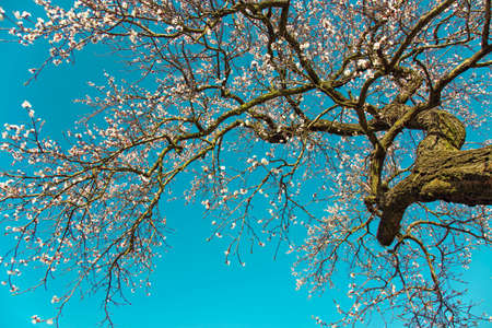 Blooming tree branch close up next to clear blue sky in a sunny spring day. Nature background for blogs, seasonal cards and web design. Selective focus