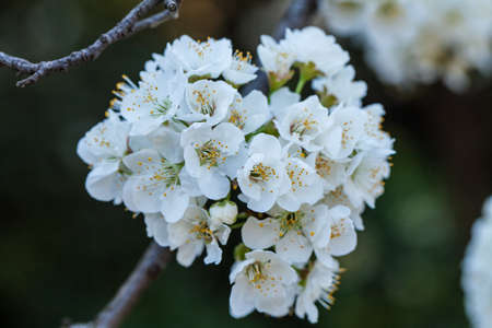 Small white flowers of Mirabelle plum on a single tree during early spring