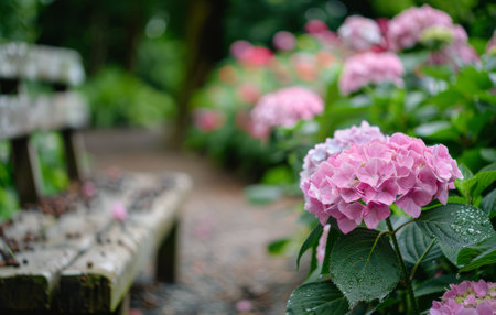 Pink hydrangeas bloom in a lush garden, cascading over a wooden bench. Petals fall from the flowers, creating a colorful, romantic scene.