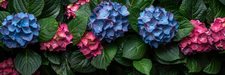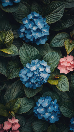 Vibrant hydrangea flowers in blue and pink shades blossom surrounded by rich green foliage in a serene garden setting.