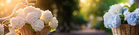 hydrangeas in a bicycle basket, space for text, romantic photo. High quality photo. Generative AI