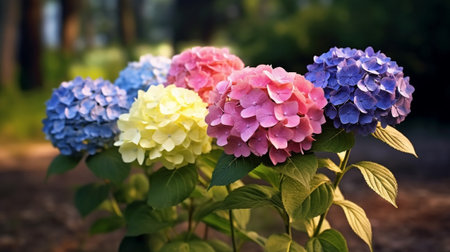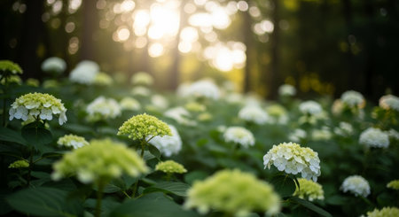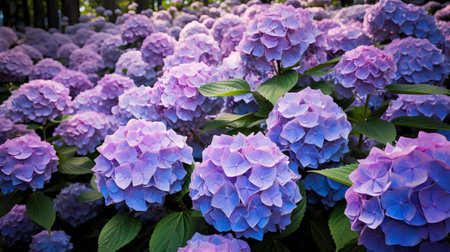hydrangea flowers bloom vibrantly in this stunning field, surrounded by lush greenery and serene natural beauty, creating a picturesque landscape perfect for relaxation and photography, with delicate petals and soft colors evoking feelings of calmness and tranquility in nature lovers. ai generated