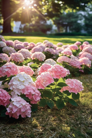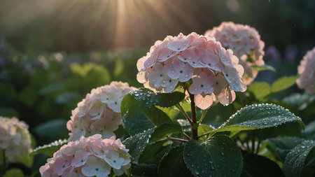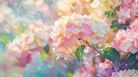 In a serene garden, delicate hydrangea flowers bloom in pastel shades of pink and white, illuminated by soft sunlight, creating a tranquil, colorful atmosphere.