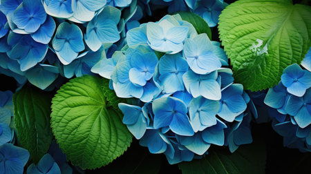 A stunning close-up of blue hydrangeas nestled in green leaves, showcasing natural beauty and vibrant colors perfect for garden and nature themes.