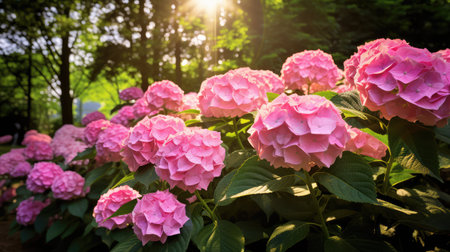 Close-up of pink hydrangeas in full bloom, bathed in sunlight. A serene garden scene.