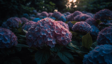 Enchanting Hydrangea Forest A lush vibrant woodland landscape filled with towering hydrangea blossoms in a variety of captivating purple blue and pink hues creating a dreamlike