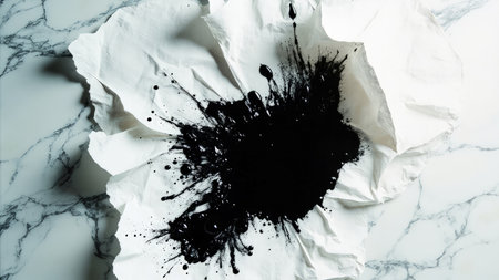 A dramatic abstract composition showcases a close-up of an ink blot on aged, crumpled paper. The interplay of black and white creates a high-contrast, monochrome aesthetic with a grunge texture. This artistic piece evokes a sense of modern design with its abstract form and splatter details. Ideal for adding an elegant and creative touch to backgrounds, graphic illustrations, and decorative elements, this image offers versatility for projects seeking a minimalist or luxury feel. The ink splash and stain effects offer a unique aesthetic.