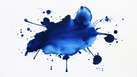 A vivid blue watercolor splash creates a striking visual on a white background, exhibiting dynamic movement through its various textures and shapes, perfect for artistic inspiration.