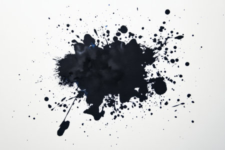 A striking black ink splatter with a central dense area and radiating fine droplets, creating an abstract and energetic visual effect on a pristine white background.