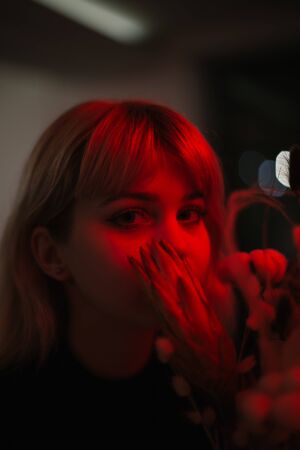 Closeup portrait of a beautiful blonde girl with long curly hair at night with neon lights of the evening city