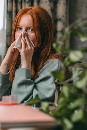 A female sneeze with a napkin in a booming cherry blossom woods in Spring due to pollen allergy. Spring seasonal concept. AI generated.