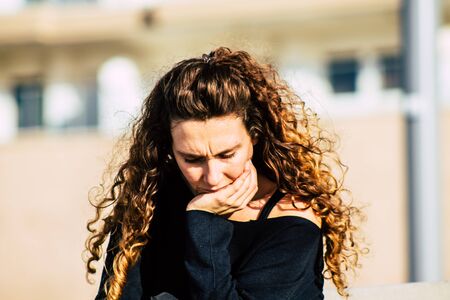 Scared Woman Crying Sitting On Floor Leaning Against Dirty Wall