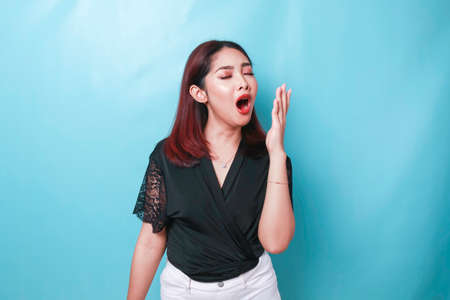 Portrait of sleepy attractive Asian woman wearing pajamas, feeling tired after night without sleep, yawning, covering opened mouth with palm