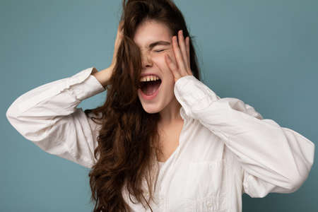 Attractive emotional cute nice adorable tender young curly brunette woman wearing white shirt isolated on blue background with copy space and shouting