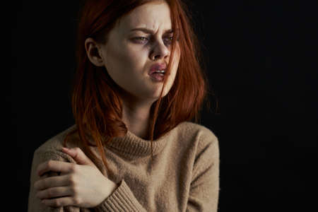 Portrait of sad young teen girl feeling unhappy, miserable and melancholy suffering from depression. In facial expressions, negative emotions and emotional pain in youth. isolated on moody background.