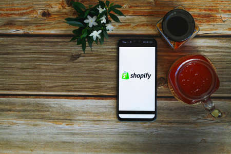 CHIANG MAI, THAILAND - August 11, 2020 : Smartphone with Shopify application on the screen in coffee shop. Shopify is an e-commerce platform for online stores.