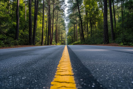Low angle view on an asphalt road leading to an unknonwn point in the forest. Diminishing perspective. Selective focus. Copy space.