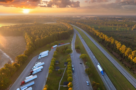 Large truck stop rest area on interstate freeway for trucks overnight parking. Recreational place during long traveling