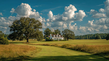 Summer evening panorama of an old farmhouse alongside a scenic country road