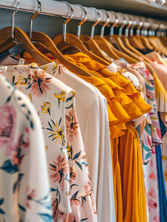 closeup of printed dress collection on hangers in a fashion store showroom