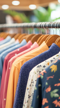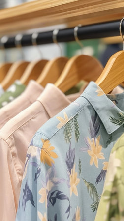 A collection of stylish shirts hangs neatly on wooden hangers inside a retail environment. The display features a variety of colors, patterns, and fabric textures, enticing shoppers.