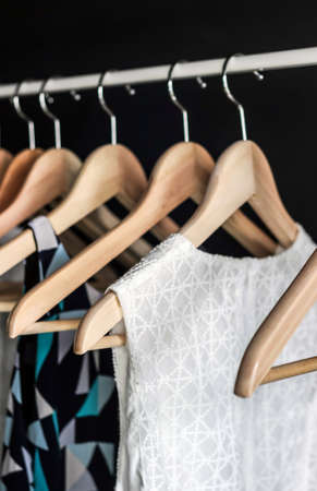 Fashionable clothes on a wardrobe rack. Hangers with garment. Hangers with different clothes in wardrobe closet. Fashion clothes hang on a hanger. Collection of female clothes hanging on rack