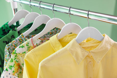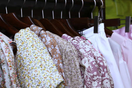 Various shirts in different colors and styles hanging on a rack in a fashionable womens closet. Creative concept of a designer dresses store.
