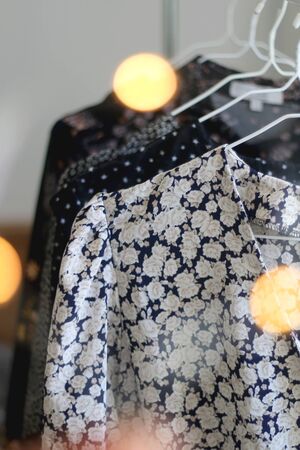 Collection of black floral dresses on a clothing rack. Selective focus, bokeh lights in the foreground.