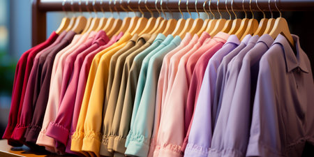 Colorful array of neatly arranged blouses on hangers. AI generation