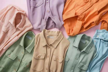 Flat lay display of fashionable casual shirts in various pastel hues, perfect for spring and summer collections