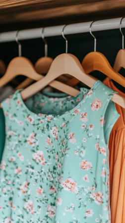 A close-up of floral dresses hanging on wooden hangers in a stylish wardrobe.