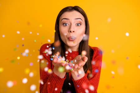 Photo of cheerful cute nice charming youngster millennial blowing confetti at you from her hands with lips pouted and amazed facial expression isolated over yellow vivid color background