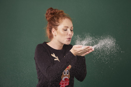Winter. Woman with red hair wearing ear muffs blowing on snow in hands