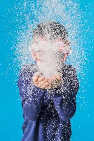 Child boy blowing snow out of his hands on blue background. Christmas and New Year holidays concept. Generation alpha and gen alpha children. Copy space