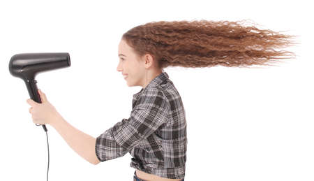 The girl dries her hair with a hairdryer on a white background, hair dryer and hair, hairdresser