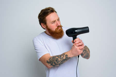 Cheerful man holding a large black hairdryer, preparing for his hair care routine with a smile, ready to achieve a stylish look
