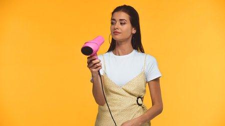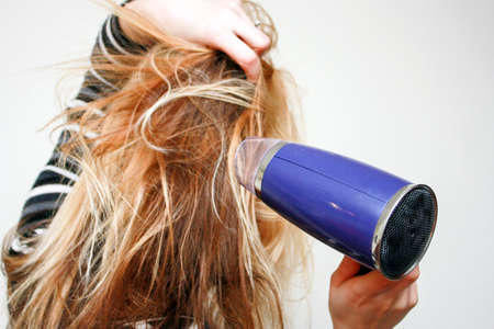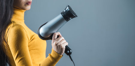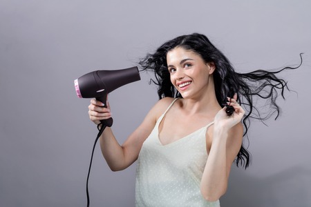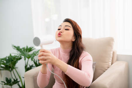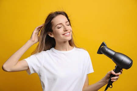 Young woman using hair dryer. Hairstyle, hairdressing concept.