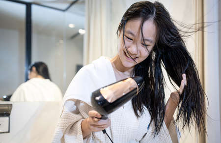 Happy asian child girl drying hair with hairdryer and smiling while blowing wind on her hair having fun,beautiful female in bathrobe using a hair dryer after taking shower dries wet hair in bathroom