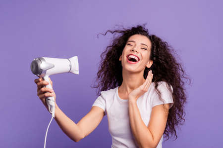 Close-up portrait of her she nice-looking cute attractive cheerful cheery well-groomed wavy-haired lady drying hair isolated on bright vivid shine violet pastel background