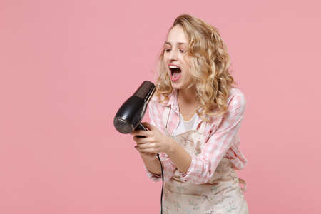 Crazy young woman housewife in casual clothes, apron posing isolated on pastel pink background in studio. Housekeeping concept. Mock up copy space. Blow drying hair, screaming, sing song in hairdryer,