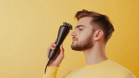 A young man holds a hair styling tool while posing against a bright yellow background in a cheerful indoor setting