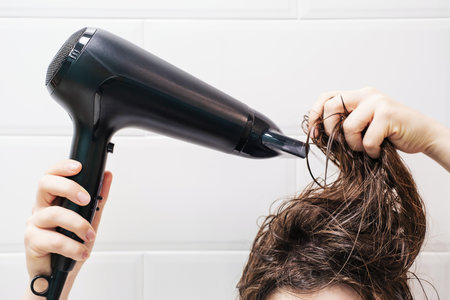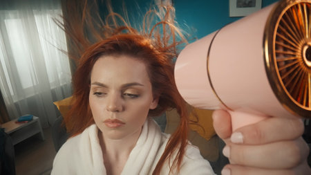 A close-up photo shows a young girl holding a hair dryer and drying her hair and styling it. Her gaze is directed downward, her hair is developing from the air flow. Sad expression on her face