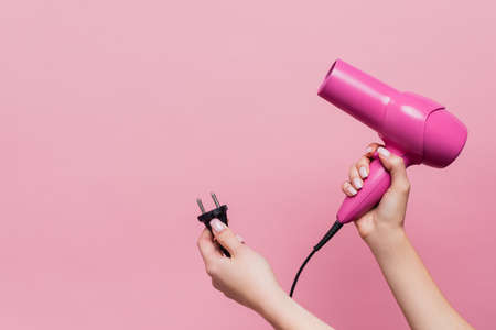cropped view of woman holding cable with plug and hair dryer isolated on pink