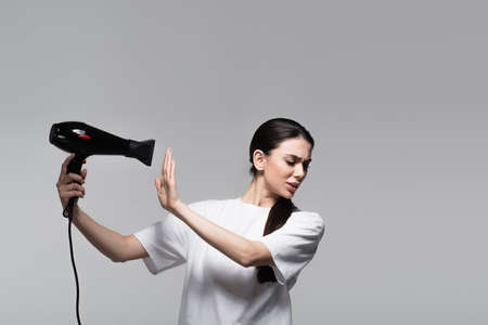 displeased woman in white t-shirt holding hair dryer isolated on grey