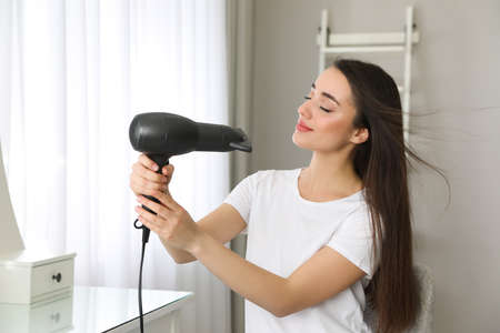 young woman using hair dryer at home or hotel. Hairstyles and lifestyle concepts