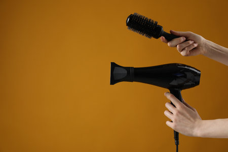 Woman with hair dryer and round brush on orange background, closeup. Space for text