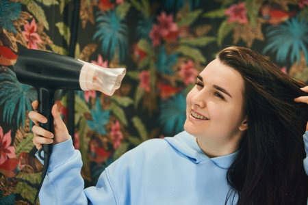 Young caucasian woman girl is blow drying her long hair using electric hair dryer with happy smiling face